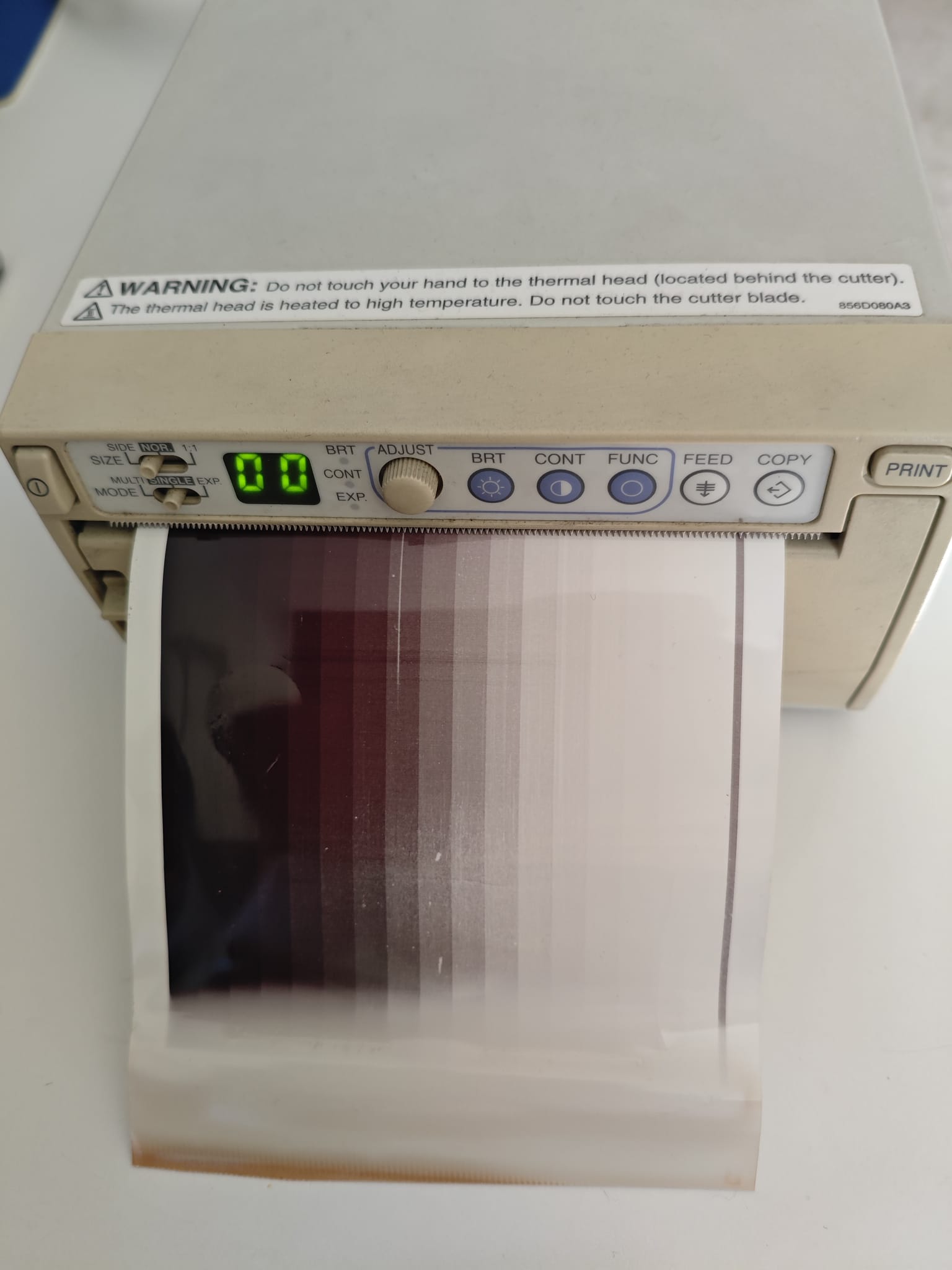 Increased horizontal resolution 1280 dots (325DPI) with 256 gradation provides better print quality, standard format (100x75 mm) is printed out during 3.9 sec. Videoprinter prints from composite videosignal (VIDEO OUT) larger SIDE print sizes (130x98 mm) too, small different ones are printed side by side (for example images of left and right hip joint). New feature is freely adjustable 0.5 - 2x EXPANSION mode, it means, that specific findings can be printed at max. width of 265mm !